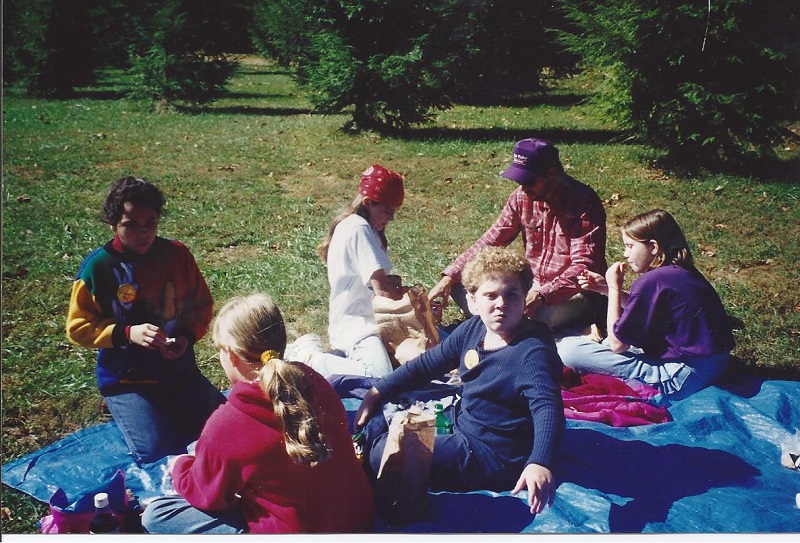 In those years every 5th grade class at all the schools had several days of "outdoor ed". A local summer camp hosted the kids and hubbie or I tried to go along to help out on several of the days with each child. It was hubbie's turn in this photo as he has lunch with daughter ( purple shirt) and her friends.