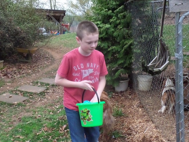 It was hard for them to eat lunch with the big tub of stuffed Easter eggs waiting to be hidden when they were finished. Thankfully the rain ended earlier after leaving only 2/10ths inch in the gauge so the grass was only wet and there was no mud so we could hide and hunt outside.