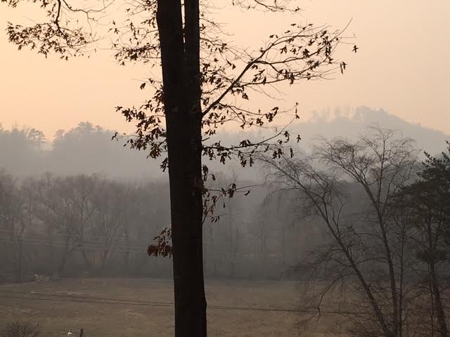 Town became chokingly filled with smoke as the afternoon rolled around. This is a picture a friend of mine took from atop Jump Off Mt , usually you can see the entire city of Hendersonville from this spot but not today !!