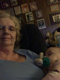 After I received this picture it was literally just minutes until daughter called me saying they were bringing the girls over here while they took Winnie to the after hours emergency vet in town. Seems she was playing with the bigger dogs and had landed on her back leg awkwardly and now wouldn't put any weight on it and seemed to be in pain. The girls arrived about 8:30 and both of them soon were sound asleep.