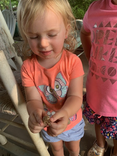 I got chores done and then had my oatmeal and fresh blueberries for breakfast. I loaded the money plant I have been working on in my Honda and a cake for delivery and headed for the Curb market. Hubbie had picked up IR ad CA earlier to stay here with him while I run into market and do our errands in town. I stopped at the PO on the way in to market . I put the 3 money plant bunches on my table and talked to the neighbor while I waited on the cake customer. After the cake was picked up I headed for Sav Mor to get some icing supplies and then stopped at the bank. I picked up lunches for the girls on the way home. We all ate lunch when I got here and then we loaded up in hubbie's truck and headed to the dump / recycle center and then to Fletcher Feed to pick up chicken feed for the month. CA napped the whole time we were gone and while we unloaded the feed. We all came inside and had a snack and then went outside to play until daughter got here to pick them up. They found an empty cicada shell and I was impressed that IR would hold it. Maybe she was shamed by the fact her little sister wasn't afraid of it.