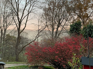 After all the girls left hubbie and I went out to get chores done. In this picture it looks like fog is settling in but it is the dust from the neighbor harvesting his soybeans. They certainly are dry enough !!! And sadly this pic shows my beautiful Burning bushes are loosing their bright red leaves.