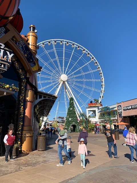 We were up very early this morning getting chores done and getting over to daughter's to pick her family up to go to Dollywood for the day. Daughter's van needs tires so we crammed everything in my Honda Pilot and I am driving us there today. Thankfully we had zero traffic problems all the way there and arrived earlier than expected. However on the drive there daughter discovered the hours were changed at Dollywood today and they didn't open until 2:00. We went to a place called The Island where there were rides and things for the kids to do while we waited for the opening. This place was great for the girls as they got to ride some different rides like this very tall ferris wheel which IR and her dad took a ride on.